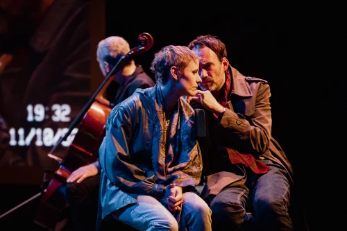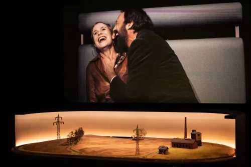 Sur la grande scène de la Comédie, dans la première histoire, à cour, un compartiment de train grandeur nature. Et à jardin, une toile de cinéma. Le dialogue en direct dans le wagon est filmé et retransmis sur l’écran. Amplification émotionnelle grâce aux gros plans sur les expressions de l’une, de l’autre. Focales qui permettent d’apprécier les riches nuances de jeu des artistes. Sous l’écran, un train miniature comme dans les chambres d’enfants. L’ensemble du dispositif est original et ingénieux. Il y a même un énigmatique chef de gare dans l’ombre. Sa présence interroge. Qui décide des aiguillages de nos vies ?