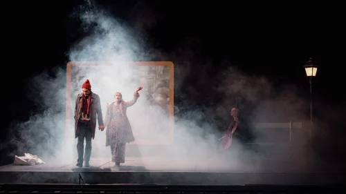 Pour la seconde histoire, en 1992, le mur est tombé et le socialisme met le cap à l’ouest. Le train miniature est remplacé par deux tapis roulants sur lesquels les protagonistes marchent pour signifier le dialogue impromptu le long des boulevards nocturnes. L’écran derrière eux renvoie des perspectives urbaines parisiennes. Et le compartiment du train à cour s’est transformé en petite place de quartier avec un banc public et un lampadaire. Une ultime déambulation pour dire le désespoir et l’amour impossible.