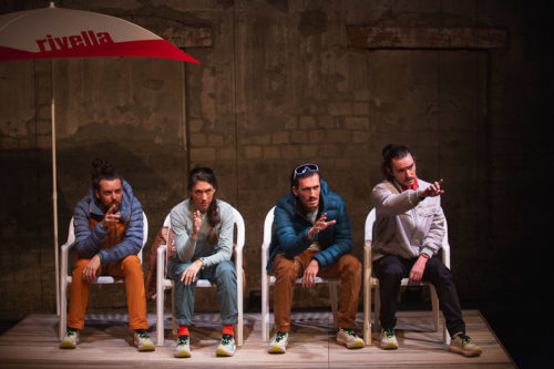 Il y a quelque chose d’enfantin dans la mise en scène de Tamara Fischer. Lorsque les protagonistes évoquent ce drapeau nazi planté lors d’une ascension, figuré ici par un parasol Rivella, on ne peut qu’en rire. La réaction du public est toutefois bien plus solennelle lorsque le même parasol est utilisé pour figurer la dépouille d’un alpiniste décédé en pleine ascension. Surtout, on admire le jeu avec les chaises de jardin en plastique : les quatre touristes porteur/euses du récit donne l’impression de jouer à être des explorateur/trices et alpinistes, progressant prudemment sur ces modules à l’équilibre souvent précaire. On retrouve aussi cette dimension enfantine dans les réplique, entre cette volonté d’être précis-e, tout en se montrant pragmatique pour faire avancer le récit. Sans oublier l’admiration portée à Ueli Steck et sa performance, qui rappellent celle d’enfants envers leurs parents.