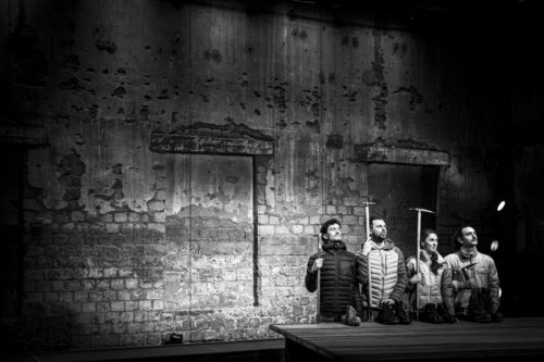 Une comédienne – Léonie Keller – et trois comédiens – Adrien Mani, Charles Mouron et Matteo Prandi – se dressent face à nous, pour narrer la façon dont Ueli Steck se prépare pour son ascension record de l’Eiger, répétant minutieusement chaque étape de son itinéraire. Tous les détails sont évoqués : matériel, vivres, répétition de chaque geste, discussions avec son épouse… Rapidement, on comprend que les protagonistes sur le plateau sont des touristes se tenant face à l’Eiger, assistant à cette fabuleuse ascension du 16 novembre 2015, et se glissant petit à petit dans la peau de l’alpiniste. Le récit s’agrémente également d’anecdotes sur Ueli Steck, ainsi qu’autour de précédents alpinistes, comme ceux qui ont donné son nom à la fameuse voie Heckmair, ou ceux qui n’ont malheureusement pas survécu à cet ogre qu’est l’Eiger. On y entend aussi certaines légendes sur le trio formé par l’Eiger, le Mönch et la Jungfrau, ainsi que sur leurs surnoms.