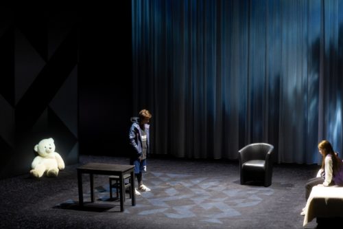 D’un côté, il y a l’histoire de Jade et Marjorie, qui nous sont souvent présentées immobiles, interdites à la manière de poupées voire pantins marionnettiques que l’on croirait échappés d’un spectacle de Gisèle Vienne (Kindertotenlieder, I Apologize). Leur relation commence par ce qu’on appelle aujourd’hui du harcèlement scolaire : Marjorie, gavroche violente et désespérée, s’en prend à Jade, plus effacée, plus lisse. Elle veut la tuer. Mais quand Marjorie, dont on apprend qu’elle est quotidiennement battue et humiliée par son père, est renvoyée du lycée et que, bravant tous les interdits parentaux, elle s’introduit une nuit dans la chambre de Jade, quelque chose bascule.