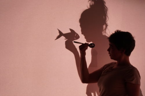 Avec douceur et légèreté, L’Ombre des choses explore de manière ludique les différentes possibilités des ombres, autant que de la lumière. Des objets du quotidien, peu de texte, quelques phrases à peine chuchotées, des onomatopées chantonnées – et pourtant, tout est aussi limpide que peut l’être un conte de fée, quand on accepte de laisser son incrédulité au placard. Au gré des tableaux, c’est à une véritable suspension du quotidien qu’on assiste : une cuillère à thé devient poisson, une boule de lumière grandit comme une bulle de savon… avant de se faire gober par une comédienne et de naviguer sous son crâne (sans doute l’une des plus jolies scénettes !).