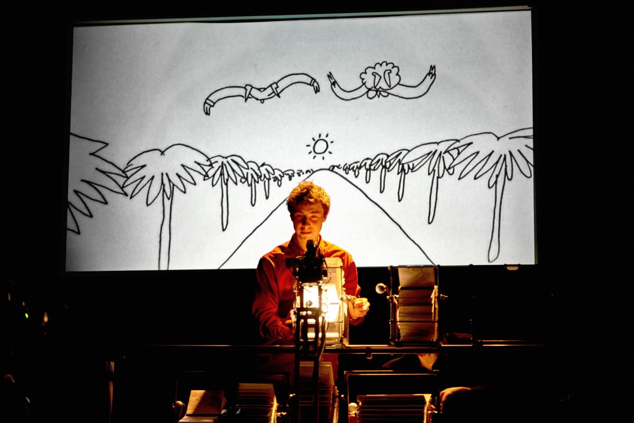 Bertrand et Léon Lenclos se partagent la scène et le micro, témoignant chacun de l’expérience particulière qu’ils entretiennent avec la capacité de voler. Tout commence par un récit de rêve, celui que Bertrand, le père, se rappelle avec exactitude. Afin de le relater, technique et objets se mêlent, tandis que sont projetées sur un écran surplombant la scène les images filmées en gros plans sur plusieurs zootropes. Semblables aux parois d’un tambour percé, les zootropes sont des jouets optiques qui présentent sur leur face intérieure (percée de fentes verticales) une série d’images avec de légères variantes. En les faisant tourner sur un axe central, on fait bouger les images qui, ainsi, donnent l’illusion d’avancer comme un film : peints en noir sur fond blanc, de minuscules personnages courent, s’élancent, s’envolent et battent des ailes, décrivant ainsi les rêves de Bertrand.