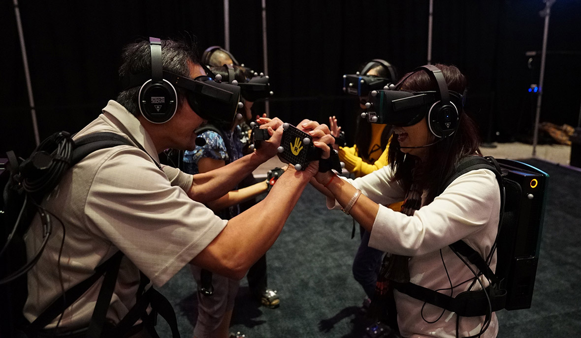 L’escapade (car il s’agit bien de partir ailleurs, munis de lunettes, de capteurs et d’un sac à dos avec ordinateur) désarçonne durant ses vingt minutes. Ici, point de joueurs solitaires comme pourraient le suggérer les cris alarmistes poussés trop souvent autour des jeux vidéo ; il s’agit davantage de découvrir les quatre autres personnes du groupe que l’on compose dans VR_1, soudain mués en avatars vêtus d’une jupe ou d’une chemise de hipster, noirs de peau ou aux cheveux longs. Être autre le temps de se découvrir dans une nouvelle enveloppe corporelle, c’est cela avant tout, la virtualité… et la virtuosité de cette pièce.