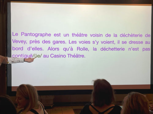 Sans s’en rendre compte, le public est déjà piégé. Le Pantographe est un théâtre voisin de la déchèterie de Vevey… Alors qu’à Rolle, la déchetterie n’est pas contiguë/üe/ au Casino Théâtre. Les mots « déchèterie, déchetterie » sont des néologismes des années 1980, protégés comme marque commerciale, nous dit Daniel Rausis. Allez savoir c’te combine ! s’étonne une personne du public amusée lors de la projection des deux panneaux de signalisation issus des deux villes. La combine est belle, le public est ravi et étonné. Il s’agit bien d’un spectacle.
