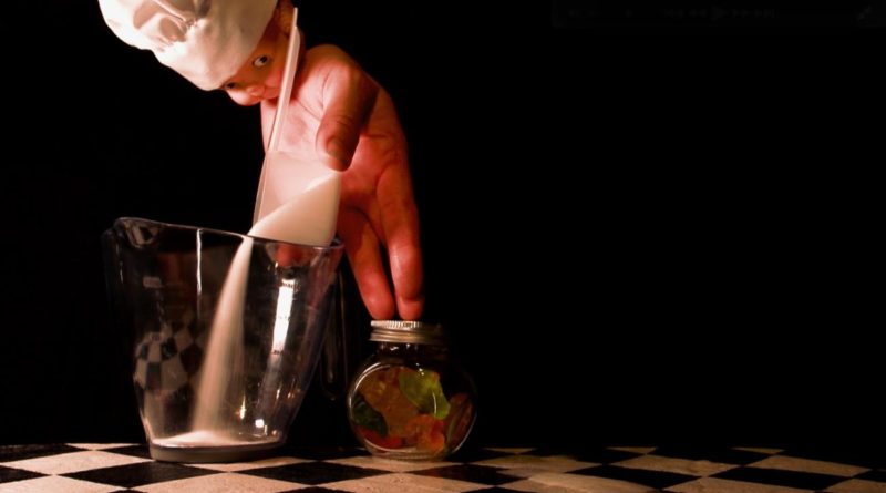 Le Baby Tyler Show nous emmène donc dans un univers façonné grâce au théâtre d’objets. Dans cette pratique, des objets du quotidien deviennent marionnettes, sans être transformés, ou presque. On retrouve ainsi, d’abord, de la pâte à modeler, qui devient personnage et évolue, pour s’adapter à un monde qui n’est pas fait pour lui, de la même manière que Baby Tyler fait face à un univers de grand-es. Ce premier personnage, donc, se voit pousser des jambes pour pouvoir passer par-dessus un obstacle, apprendre à vivre la parentalité, ou devra trouver une manière de s’évader de prison, après avoir été emprisonné injustement. En ce sens, le Baby Tyler Show s’apparente à une véritable quête de vie. Pour rappeler l’enfance, une grande partie du spectacle s’appuie aussi sur des bonbons, à commencer par les gummybears, avec leur voiture en guimauve et autre sucreries acidulées, une boîte de nuit où d’autres gummybears ne les acceptent d’abord pas – la faute à une taille et une coiffure différentes – et un policier (lui aussi gummybear), garant de la quiétude de la sécurité, qui peine à comprendre les gens qui l’entourent…
