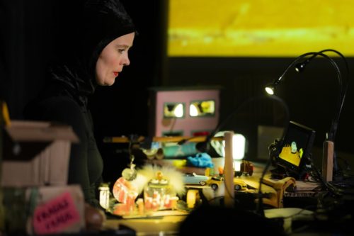Si le théâtre d’objets est une pratique déjà répandue depuis les années 70, l’originalité de ce spectacle réside dans l’utilisation de la vidéo. D’abord, la projection permet simplement de voir en plus grand ce qui est joué sous nos yeux. Si cela s’arrêtait là, le Baby Tyler Show n’aurait pas plus d’intérêt. Or, Ingrid Hansen, forte de son expérience dans la marionnette télévisuelle, se sert véritablement de la caméra pour apporter une dimension supplémentaire au spectacle. Il y a d’abord ce jeu sur les perspectives, avec cette île vue du dessus, qui est en réalité accrochée à la verticale et filmée de face. La proximité ou l’éloignement de certains appareils de prise de vue permet également de jouer sur la taille. Notons aussi les filtres de couleur : le rouge pour illustrer la chaleur écrasante sur l’île déserte, ou le bleu pour symboliser les profondeurs marines lorsque Baby Tyler rencontre un requin. Et puis, il y a ces jolies trouvailles, en utilisant tout simplement les mains pour figurer la fermeture de l’obturateur, à la fin de certaines scènes.