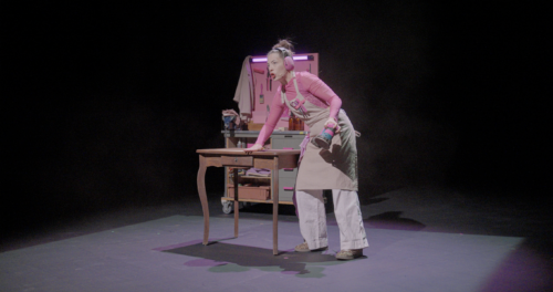La soirée s’est poursuivie au Théâtre du Loup, avec le seule-en-scène de Salma Gisler. Le côté décalé de ses réponses en interview se retrouvent parfaitement dans le spectacle, où l’identité de cette toute jeune compagnie se développe. Tout commence dans le foyer, où la douce voix de la comédienne nous invite à entrer dans la salle, en nous décrivant l’entrée de celle-ci, le plateau et son personnage de Salva, qui nous attend à cour pour nous accueillir. Nous entrons ainsi dans « Les Ateliers de Salva », qui va nous apprendre, comme elle nous l’avait promis, à retaper différents meubles.