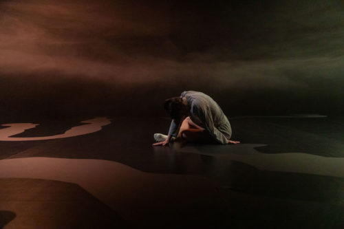 Nimbé d’une fumée ouatée sur laquelle miroite l’opalescence des spots, le plateau se déploie devant nous. Au sol, de curieuses formes grises se découpent, peintes sur un tapis de danse aussi noir que l’encre – ou qu’une nuit sans étoiles. Ces formes sont-elles des îlots… ou, au contraire, des cours d’eau ? Les dessins d’un mystérieux mycélium… le parcours d’une mousse qui ronge la pierre ? Les secrets d’un lichen serpentant contre une écorce ? L’esprit vagabonde, on se prend à rêver comme si l’on se perdait, peu à peu, dans un sous-bois qui nous est étranger. Hors-temps, l’ambiance rappelle celle de certains films de Miyazaki, en particulier Princesse Mononoké : on se croirait dans les marécages féériques où s’étend la magie du dieu-cerf, gardien de la nature.