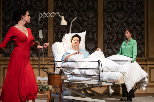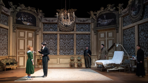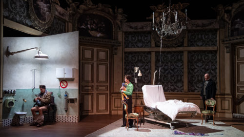 Ainsi mise en scène facétieuse, scénographie raffinée et direction d’acteur·trice·s de luxe (l’une comme les autres) nous permettent tout au long du spectacle une lecture riche et à plusieurs niveaux de ce chef-d’œuvre théâtral. On est entre connaisseurs du Maître, cela se sent. Liermier est tombé il y a longtemps dans la soupe poqueline. Les détails sont nombreux, tant dans la reproduction des tableaux de médecins qui ornent le logis que dans la symbolique de certains choix : la porte barrée sur la chambre de la mère absente, les perspectives biaisées des murs disant sans le dire que quelque chose cloche dans ce monde-là, le lit d’hôpital pour souligner l’envahissement médical sans oublier les multiples performances des comédien·ne·s.