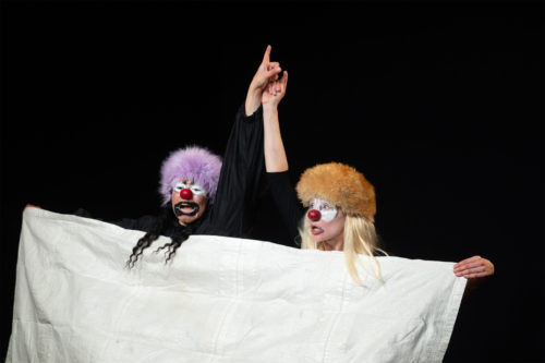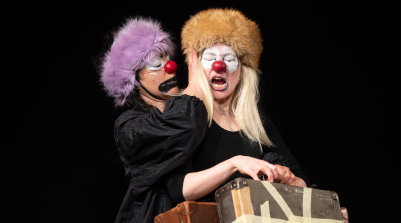 Le choix de la scène vide soutient le propos de nulle part, de même pas d’ici, même pas du pays. À remarquer les très intéressants éclairages de Maya Bringhen et l’enveloppe sonore d’Adrien Koumrouyan. Le relief choisi est une part d’absurde, simple, répétitif qui provoque l’intérêt sans passer directement par l’émotion. C’est du nez rouge sans cirque, du grotesque sans piste, du drôle à sourire. On y retrouve un classique du genre avec le jeu des valises au lever de rideaux. La magie de Marcel Marceau n’est jamais bien loin. Un clin d’œil, une citation.