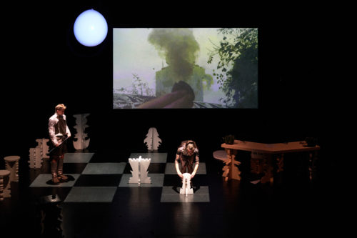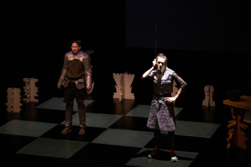 La scénographie est à l’image de leur imagination débordante, avec des piliers en cartons style art déco qui se déplacent pour former tour à tour des pièces d’échiquier, des champignons, une tour de radio… Leurs costumes sont également DIY, avec des armures de chevalier créées à partir d’opercules de cannettes, peut-être celles des cannettes de la tante Eli d’Axel, dont iel garde de tendres souvenirs.