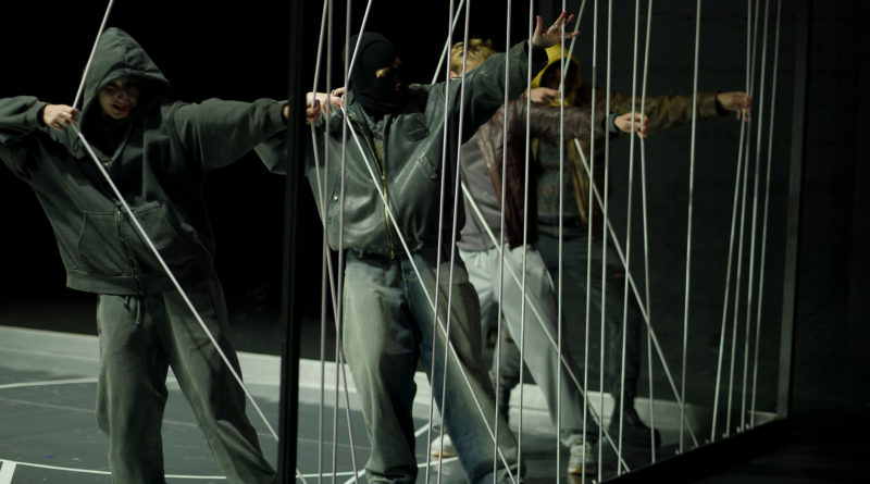 Si elle renvoie à l’idée d’un piège, la scénographie est aussi, pour les corps, un espace de jeu, elle les entrave, leur offre une gamme nouvelle de mouvements, notamment avec les élastiques tendus qui, en même temps, ferment et ouvrent une partie du cube. Les mouvements sont extrêmement chorégraphiés. Dans un jeu maîtrisé et millimétré, l’ensemble des comédien-nes (Eliot Sidler, Camille Legrand, Diane Dormet, François Revaclier, Roberto Garieri) sont aussi danseur-euses englobé-es et porté-es par un univers sonore travaillé (Fernando De Miguel). Iels passent avec aisance et justesse d’un rôle à un autre. Les corps, les gestes, les voix sont métamorphosées et font s’échouer vers l’extérieur des intériorités. Si les paroles sont en partie désincarnées – mettant en avant les aspects littéraires et poétiques de chacune des langues plutôt qu’une forme de réalisme : ce n’est pas une langue de la jeunesse, mais elle saisit quelque chose de cet instant de la vie – elles demeurent cependant profondément ancrées dans les corps.