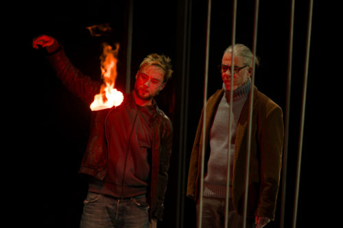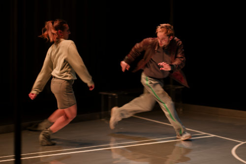 Les choix de mise en scène viennent renforcer et affirmer les différences des textes. Le jeu fait entendre les musicalités des langues sans vouloir les unifier. Le travail en lumière (David Kretonic) compose avec des tonalités différentes conjointement avec la création costumes (Eléonore Cassaigneau) aux silhouettes proprement dessinées et contemporaines : du froid, nous passerons au chaud. Deux spectacles. Deux récits qui ne se rencontrent pas. Des textes différents dans leur forme. Deux parties distinctes au plateau, mais au centre un espace qui réunit : des coulisses rendues visibles et un cube imposant, décentré, transparent, composé de vitres, de vide et d’élastiques. Le travail de l’espace renvoie à l’idée d’un piège transparent qui montre plus qu’il ne dissimule, qui étouffe plus qu’il ne protège, et si on en sort, c’est pour se cacher encore ou disparaître. Dedans. Dehors. Notions anéanties ou devenues paradoxales. Au sein de ce sordide des mots et des corps, visuellement tout est lumineux, propre et maîtrisé. Cependant rien ne protège. Si ce n’est peut-être l’amitié.