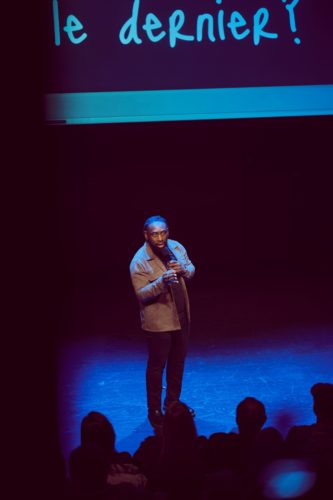 L’affiche du spectacle a de quoi intriguer : Christian Mukuna se tient face à nous, une fourchette à la main. Au bout de celle-ci, un petit pois. Et en grosses lettres blanches, le titre : Et si c’était le dernier ?. L’humoriste s’expliquera sur le pourquoi de cette affiche durant le spectacle, mais chut, on ne dira rien ici. Si ce n’est, peut-être, qu’il a effectivement vendu 200 boîtes de petits pois personnalisées, pour soutenir des associations luttant contre plusieurs formes de violence. Un signe fort de son engagement. Sur la scène, l’ouverture du one-man-show surprend également. Et pour cause : Christian Mukuna n’est pas là ! C’est une vidéo, projetée dans un cadre rappelant les énormes télévisions sur roulettes que l’on nous proposait au secondaire, qui nous accueille. De fausses pubs le mettant en scène sont diffusées, pour déclarer son amour au cinéma et nous avertir que ce spectacle ne sera pas habituel. Il viendra ensuite nous parler de ses dernières fois, avec la question de l’âge au centre du propos, ce moment où on devient vieux, et comment… Il évoquera aussi ses origines congolaises, l’accueil de son canton de Neuchâtel adoptif, sa vie de couple et de futur père. Et si c’était le dernier ? est un spectacle sur la nostalgie, avec cette jolie citation de Victor Hugo en exergue : « La nostalgie, c’est le bonheur d’être triste. »