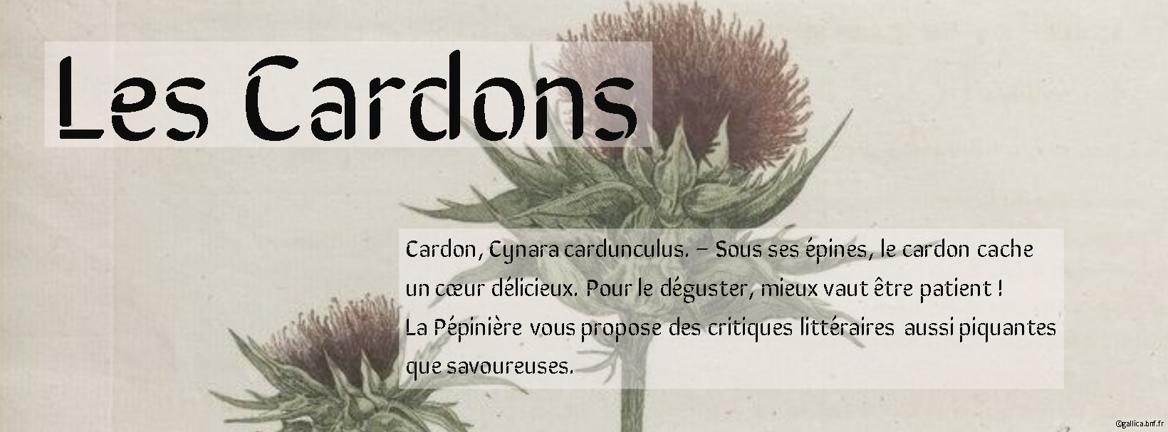 « Il faut cultiver notre jardin », disait le Candide de Voltaire. La Pépinière fait sienne cette philosophie et la renverse. Soucieuse de biodiversité, elle défend un environnent riche, où nature et culture deviendraient synonymes. Des planches d’une scènes aux mots d’une page, des salles obscures aux salles de concert, nous vous emmenons à la découverte de la culture genevoise et régionale. Critiques, reportages, rencontres, la Pépinière fait péter les barrières. Avec un mot d’ordre : jardinez votre culture !
