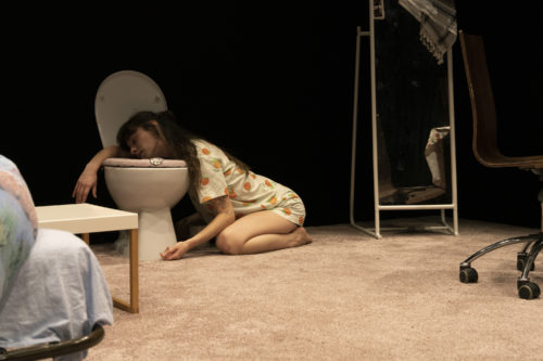 Durant la première moitié du spectacle, Emilie Cavalieri explore cette liberté d’être soi. Il s’agit d’un travail qu’elle avait déjà débuté dans le cadre de son Bachelor à la Manufacture, puis dans un solo présenté au festival C’est déjà demain. Sans jamais tomber du côté d’un franc malaise – car il y a toujours une friction à oser montrer ce qui d’ordinaire reste caché – nous suivons le déroulé de cette soirée, ordinaire et solitaire. Tout est juste, le jeu, le ton, le rythme, et s’enchaîne au rythme des pensées qui adviennent et sont formulées à haute voix. On savoure alors avec elle nos moments de solitude d’une extraordinaire quotidienneté, quand ni notre corps, ni nos émotions, ni notre imagination ne connaissent de censure. Elle donne à entendre ces monologues que l’on peut se faire à soi, à voix basse ou haute, et qui touchent, parfois sans en avoir l’air, à des sujets importants et des réflexions profondes, à des résolutions et des élans, qui ne verront pas toujours le jour, mais auront le pouvoir de nous faire nous sentir vivant·e·s. Et c’est cette force du moment et de l’émotion d’être soi que l’on perçoit chez la comédienne, et qui se transmet au public.