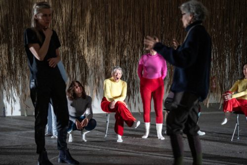 Dès le seuil, on est dedans. Mille et un roseaux suspendus occupe le volume, des tiges de Camargue plantées au plafond, qui tremblent au passage des corps. On entend des voix sans voir celles qui parlent. Créateur d’environnements et installations sonores, Rudy Decelière a travaillé les archives audios de la compagnie sturmfrei fondée par Maya Bösch – vingt-cinq ans de créations. Pour en faire une matière qui circule, se froisse, se répond. Par endroits on distingue des mots, ailleurs ce n’est plus que du souffle, de la pulsation. On peut rester à l’extérieur de ce rideau végétal ou choisir de s’y enfoncer. Les voix deviennent plus proches, puis s’éloignent. On ne sait plus très bien qui parle, ni d’où.