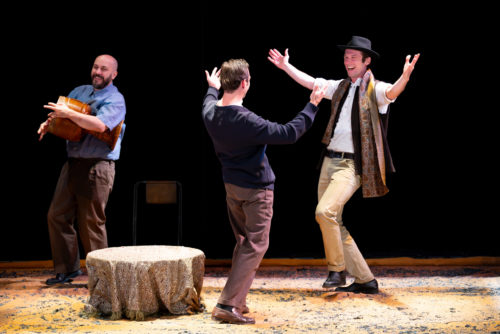 Au plateau, six comédiennes et comédiens extraordinaires servent donc l’intimité du texte d’Aïla Navidi. Iels sont aidés pour cela par une scénographie tout aussi admirable : un immense tapis (persan ?) au sol qui va se dresser pour faire office de tulle permettant de démultiplier les espaces à travers les différentes chronologies du spectacle. À noter aussi la très forte idée des feuilles mortes qui jonchent le parterre et symbolisent la quête d’un impossible retour. Au surplus, une table basse, quelques chaises, bref très peu de décor pour une dramaturgie en perpétuel mouvement sublimée par des lumières incandescentes. On n’est pas loin des mises en scène de Wajdi Mouawad lorsqu’il dresse ses grandes fresques oniriques.