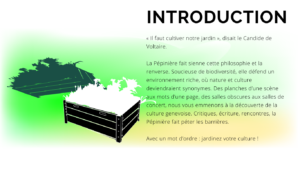« Il faut cultiver notre jardin », disait le Candide de Voltaire. La Pépinière fait sienne cette philosophie et la renverse. Soucieuse de biodiversité, elle défend un environnent riche, où nature et culture deviendraient synonymes. Des planches d’une scènes aux mots d’une page, des salles obscures aux salles de concert, nous vous emmenons à la découverte de la culture genevoise et régionale. Critiques, reportages, rencontres, la Pépinière fait péter les barrières. Avec un mot d’ordre : jardinez votre culture !