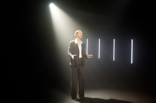 Seulement voilà, les choses peuvent être ainsi tant qu’elles ne nous touchent pas personnellement. C’est ce qu’illustre parfaitement l’histoire de Tessa. Durant environ une demi-heure, le texte est cinglant, narrant ce système et ce milieu qui semble déconnectés de toute réalité. On rit, certes un peu jaune, mais on rit, en se disant que c’est son métier et qu’elle l’exerce plutôt bien, au-delà de toute autre considération. Oui mais… Après ce premier temps, tout bascule : la vie de Tessa comme le ton du propos. Et alors, toute la réflexion change. Difficile d’entrer dans les détails sans divulgâcher toute cette histoire. Ce qu’on peut en dire, c’est que la perspective de l’avocate change du tout au tout. Et alors qu’on l’écoutait déjà avec attention, nous voilà cette fois totalement pendu·e·s à ses lèvres, recevant chaque mot qu’elle prononce comme un coup de poing. Ce changement de paradigme est annoncé symboliquement et subtilement par son passage derrière les cinq néons installés à la verticale à cour. Comme si Tessa passait de l’autre côté. Sur la scène, il n’y a donc d’autre décor que ces néons. Le reste est suggéré par les déplacements d’Anna Budde et le magnifique jeu de lumières de Danielle Milovic. Le tout permet de passer de la chaleur de la boîte de nuit à la lumière froide et intransigeante du tribunal, en passant par la dimension intime de la solitude dans laquelle Tessa se retrouve parfois.