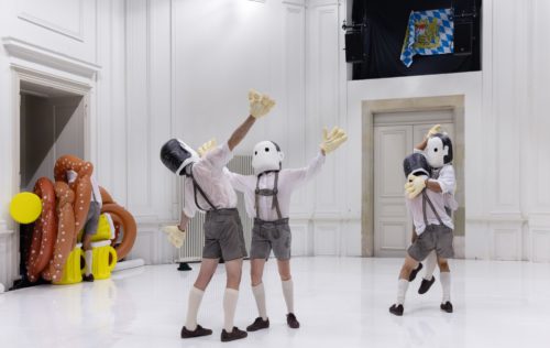 Le ton oscille constamment entre sérieux et dérision. Berrettini nous sert des invectives en allemand et un discours sur le capitalisme illustré avec des exemples bavarois, puis instaure une inquiétante étrangeté avec des figures masquées et des bouées en forme de bretzel et de chope de bière. Un danseur s’adresse directement au public pour lui demander s’il en a « assez » et s’il souhaite une « vraie fin ». Pour finir, une fléchette tombe du plafond, manquant le rond lumineux, comme un gag absurde soulignant l’impossible visée de la pièce : toucher juste, mais où, et pour qui ?