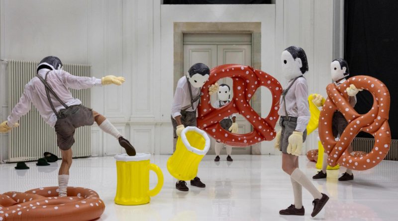 Le ton oscille constamment entre sérieux et dérision. Berrettini nous sert des invectives en allemand et un discours sur le capitalisme illustré avec des exemples bavarois, puis instaure une inquiétante étrangeté avec des figures masquées et des bouées en forme de bretzel et de chope de bière. Un danseur s’adresse directement au public pour lui demander s’il en a « assez » et s’il souhaite une « vraie fin ». Pour finir, une fléchette tombe du plafond, manquant le rond lumineux, comme un gag absurde soulignant l’impossible visée de la pièce : toucher juste, mais où, et pour qui ?