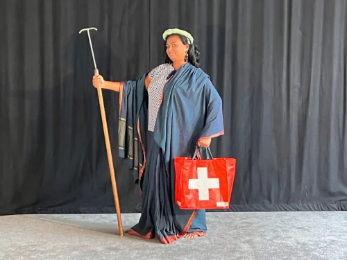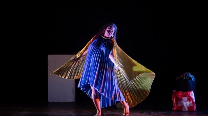 Smiley nous accueille dans la salle avec douceur. Elle nous salue, joliment habillée avec un sac de commission rouge orné d’une croix helvétique (…) Le spectacle commence alors qu’elle est encore parmi le public. Elle fredonne les premières notes de notre hymne national, et tout de suite le décalage entre le personnage et l’acte crée un effet comique. S’ensuit une série de questions adressées à la volée aux spectateur/trices : D’où venez-vous ? Êtes-vous marié-e ? Avez-vous des enfants ?… Elle prend bien soin de ne laisser répondre personne et on comprend vite que c’est à elle qu’on a mille fois fait vivre ces interrogatoires intrusifs. Mais loin de tomber dans un récit plombé, elle prend le plateau avec sa dégaine clownesque pour sortir de son cabas une bouteille vide de Rivella qu’elle chérit comme symbole de son parcours de migration transcontinentale. Un déchet plastique qui lui échappera vite des mains et qu’elle n’arrivera dès lors plus à rattraper… Effet comique garanti une nouvelle fois… comme pour symboliser la difficulté de s’intégrer ? Tout le contraste de Smiley est dans cette tension assumée entre le drame et la comédie. Et c’est sa grande force.