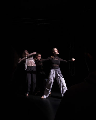 Nous avons d’abord pu assister à Encore mais En Corps, la performance du trio Collectif FÄZ, composé de Zoé De Reynier, Fanny Vaucher et Rosine Ponti (cette dernière remplaçant Maëlle Bordas, qui a créé le spectacle avec les deux autres). Tout commence comme si trois poupées de boîte à musique dansaient, coincées dans un mouvement qui ne change jamais. Une métaphore de la condition de leur personnage, dont elles tentent de sortir, mais font face à un blocage. C’est alors qu’une lumière arrive, de trois-quarts face, comme une porte de sortie, un espoir. Chacune tente de s’en approcher, dans un mouvement entre concurrence et soutien : comme si chacune voulait écarter l’autre du chemin, mais la soutenait quand elle se retrouve en difficulté. Le paradoxe est total, et illustre celui entre le blocage physique ou émotionnel et la force mentale nécessaire pour dépasser cette condition. Petit à petit, la musique semble également prendre le dessus sur les trois danseuses et les contrôler. Leurs corps se meuvent en pas de danse contemporaine, mêlée de diverses influences street-style. Elles tentent de lutter, mais la force musicale demeure supérieure. En témoigne cette dernière scène où, lorsque la musique s’arrête, leur souffle semble enfin leur revenir, comme si elles respiraient à nouveau. Un moment poétique, physique et émotionnel fort. Pour la suite, le collectif souhaiterait allonger cette forme, en approfondissant la réflexion, qui peut être explorée encore et encore. Avec une telle matière et les relations à creuser entre les trois personnages dansants, le potentiel semble être presque infini. Ou comment le corps et le mental peuvent s’opposer, ou s’allier, pour contribuer à se dépasser.