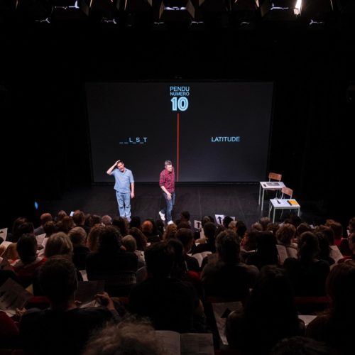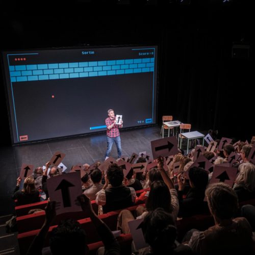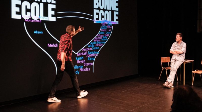 Sur la forme, Arnaud Hoedt et Jérôme Piron reprennent les codes qui ont fait le succès de La convivialité ou la faute de l’orthographe. On a déjà évoqué le côté conférence, et toute la documentation sur laquelle ils se basent (Philippe Meirieu, Pierre Merle, André Antibi…). Que dire des interactions avec le public, qui sont une marque de fabrique de la Cie Chantal & Bernadette ? Cette fois-ci, au lieu de papier et de crayon, on nous distribue une flèche à l’entrée. À l’aide d’un ingénieux système de caméra et de traitement de l’image, on nous fait participer à un jeu, pour nous montrer comment on peut réussir en collaborant – l’une des pistes à explorer pour réformer le système. On nous met également à l’épreuve d’un jeu du pendu, pour illustrer certains biais dont on peut être victime, et notamment la fameuse menace du stéréotype. En ne se cantonnant pas à une dimension théorique, mais en nous plaçant, tels des cobayes, dans une expérience sociale, ils nous permettent de mieux comprendre ce dont ils parlent, en le vivant directement. On évoquera aussi la dimension très imagée, notamment lorsque l’école est comparée à un marché – un constat particulièrement vrai pour la France – et un parallèle fait avec Amazon, nous invitant à faire nos choix en ligne. Il nous paraît particulièrement convaincant d’utiliser un référentiel partagé par tout le monde, ou presque, pour mieux intégrer toutes ces notions.