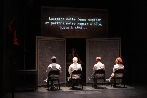 Le malaise ne se trouve pas que dans les mots de Penda Diouf. Il existe dans le corps d’Amélie Chérubin Soulières (joyeux et confiant lors de la scène initiale, détruit et prostré après l’enfermement). Il se retrouve dans la scénographie de Fredy Porras, conçue sur le mode de l’écran ou de la trappe – qui révèle ou qui cache. Le décor se compose de panneaux amovibles tendus de tulle, une matière sensible à la lumière qui permet de jouer avec la transparence. Grâce aux projections vidéo imaginées par Francesco Cesalli et à l’éclairage créé par Michel Faure, les panneaux révèlent ou occultent ainsi certains pans de l’espace, donnant la sensation d’être bourreau ou victime.