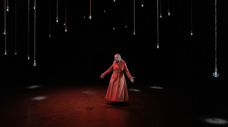 Entrer dans la salle du Galpon en laissant derrière soi la rumeur de la ville, c’est déjà pénétrer dans le lieu suspendu du conte. Or, cette suspension apparaît avant même que le spectacle commence : elle est là, accrochée au plafond sous forme d’une myriade d’ampoules, dont la douce lumière nimbe les sièges, la scène, nos mains. À des hauteurs différentes, tantôt ventrues comme des lampes magiques, tantôt menues comme des tiges d’herbes, elles rappellent un vol de lucioles, une Voie lactée que notre présence aurait effrayées… mais qui ne s’enfuient pas. Aucun autre décor en vue.