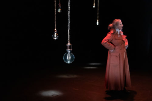Car l’art de la conteuse va au-delà du texte. C’est un écosystème complexe qui, sous couvert d’une simplicité trompeuse, révèle un art aussi complet que complexe. Il y a, bien sûr, la performance d’oralisation : la manière de prononcer les mots, de les articuler, de les incarner en faisant varier les timbres et les hauteurs de voix, par exemple, comme si on les dégustait. Le Gardien, redoutable chef des soldats dans « La Poupée », fait face à une fillette terrifiée ; l’homme à la recherche d’une autre vie dans « Les Souliers » bégaie face à celle qu’il pense être le double de sa femme (mais qui, en réalité, est bel et bien sa propre femme)… À cela s’ajoute l’expression du visage, les mimiques souvent redoublées par des mimes discrets : les moustaches du cadi du Caire, qui veut couper la tête du Capitaine Moïn ; la cavalcade des bisons qui s’élancent dans la pente ; la colère sifflante de la Vouivre qui s’approche en battant des ailes ; la fillette qui glisse sa poupée sous son tablier… Les gestes de la conteuse font tout autant advenir les éléments de décor qui n’existent que grâce aux mots – comme dans cette scène, déchirante, du père qui se détourne de sa fille en ouvrant une porte pour disparaître dans la nuit (« La Poupée »). Il n’y a rien de statique dans Les Voyages inattendus – au contraire, les contes sont aussi vivants que peuvent l’être des histoires qui n’existent qu’en rêve. La mise en scène de Nathalie Cuenet repose ainsi sur des interactions fines entre les différentes actrices du spectacle : conteuse, lumière et musique. Les ampoules ne servent pas seulement à éclairer, mais à suggérer une maison dans un village, la traversée d’une forêt, la déambulation nocturne dans une ville. De même, la bande-son, avec ses amples variations de volume, chuchote parfois comme la rumeur d’une place de marché… ou éclate à la manière d’un orage qui menace de nous tremper. Avec une inventivité discrète et une poésie volontiers malicieuse, Les Voyages inattendus prouvent que, pour croire en l’ailleurs, il faut peu de choses.