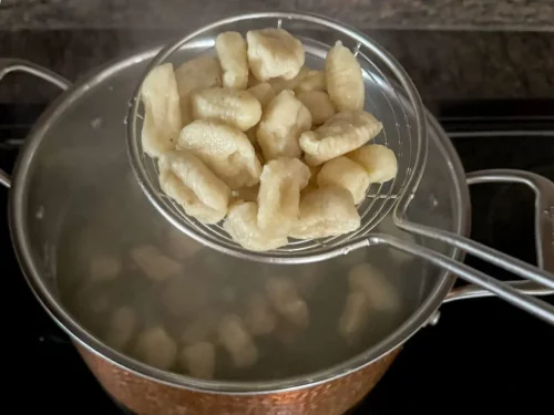 Elle nous raconte tout cela en préparant les gnocchi. D’abord cuire les patates et, après avoir apprécié leur douce chaleur dans le pli du coude, les éplucher, les passer ensuite au presse-purée, rajouter de la farine, du sel, faire la pâte, en détacher des rouleaux puis les couper en petits cubes. À côté, faire mijoter le coulis de tomates avec beaucoup d’huile d’olive. Enfin, plonger les gnocchi dans l’eau bouillante et attendre qu’ils remontent à la surface pour les mélanger ensuite avec la sauce… et nous proposer de les goûter.
