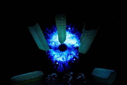 Au fond, un immense hublot circulaire, œil ou astre, diffuse les vidéos hypnotiques de Marco Brambilla, voyage stellaire entre naissance d’étoiles et trous noirs. Nous ne sommes plus à Allemonde, mais quelque part dans un cosmos froid magnétique et un brin kitsch.