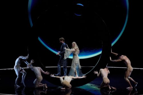 On n’entre pas dans ce Pelléas et Mélisande comme dans un opéra ordinaire. On y pénètre comme dans un rêve minéral, un espace galactique où les personnages sont des naufragés. D’emblée, le ton est donné : l’univers scénique, conçu par Marina Abramović, est peuplé de grands cristaux translucides, capsules de mémoire et de temps, qui recomposent l’espace au gré des scènes – grotte, château, forêt. La scénographie tuile le médiéval à la science-fiction chère au cinéma de la fin des années 70 et des années 80.