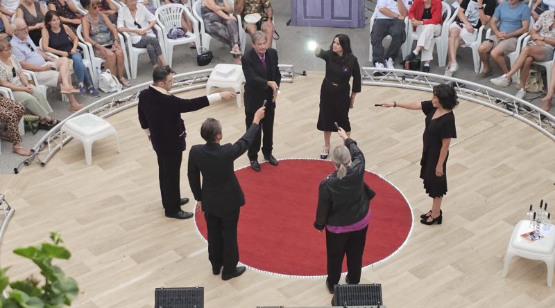 Ensuite la surprise de la disposition de la scène en cercle. Six mètres de diamètre avec un quatrième mur à 360 degrés. Cela fait penser à une piste de cirque. Et ça pique la curiosité. Où s’asseoir ? Comment va se passer la circulation des comédien-nes sur ce plateau ? Les décors sont minimalistes et élégants, translucides et violets clairs… la couleur de la mort… On continue à se raconter l’histoire avant même le début du spectacle.