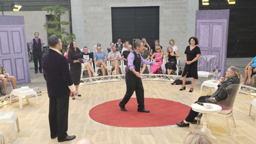 On se rend ainsi mieux compte de l’ambition de l’entreprise : recréer les conditions du huis-clos dans un espace ouvert. Le public va être invité à mener l’enquête pour découvrir qui de la metteuse en scène, de la directrice de l’Odéon, des deux comédiens ou même du sergent de police présent pourrait avoir tué Sarah. Tous des gens respectables soigneusement abrités derrière le vernis social. Y compris le concierge ? Nous n’en dirons pas plus.