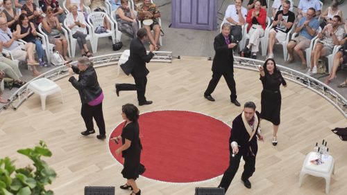 Au niveau de la scénographie, le dispositif circulaire oblige d’être constamment en mouvement avec une vigilance de tout instant pour distribuer équitablement les adresses verbales et non-verbales au public. Cela influence le jeu des artistes qui forment un collectif solidaire pour faire avancer une intrigue en dents de scie entre tension dramatique et respirations plus ou moins humoristiques.