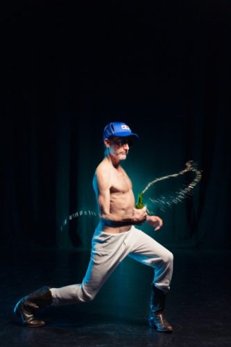 D’humour, Tout se pète la gueule, chérie n’en manque pas ! Même dans ses passages chorégraphiés. On évoquera ainsi ce premier tableau, dansé bière à la main et à moitié vêtus – en slip et t-shirt pour certains, ou à torse nu et en collants pour d’autres. Si on n’avait pas encore compris qu’il s’agissait d’une masculinité presque stéréotypée du continent nord-américain tel qu’on le perçoit… Ce premier tableau, donc, se termine par une bouteille qui se vide de manière ridicule, comme un pénis sans vigueur. On pourra aussi parler de ce numéro de pole dance – interprété nu, est-il besoin de le préciser ? Pour narrer et développer son propos, Frédérick Gravel, en collaboration avec les deux autres danseurs et le musicien, choisit donc une forme décalée, mais aussi une grande dimension corporelle. Au fil des numéros se développe ainsi une impressionnante démonstration de force et de souplesse.