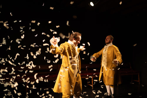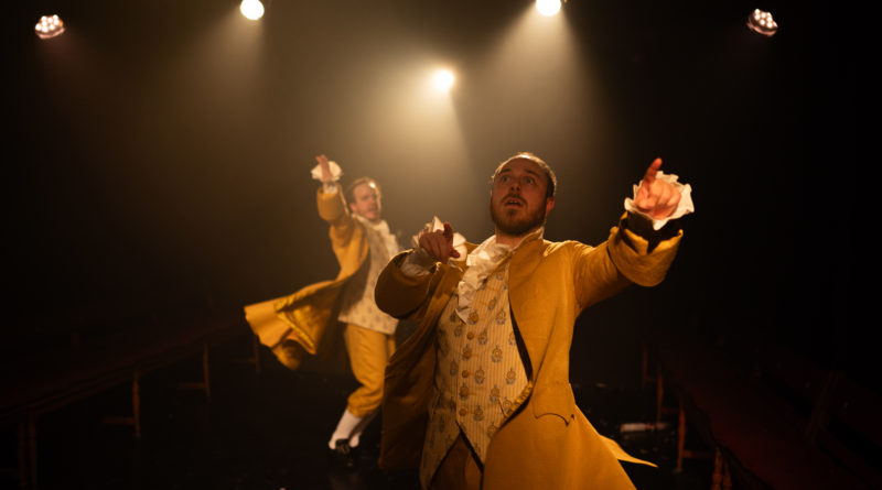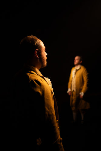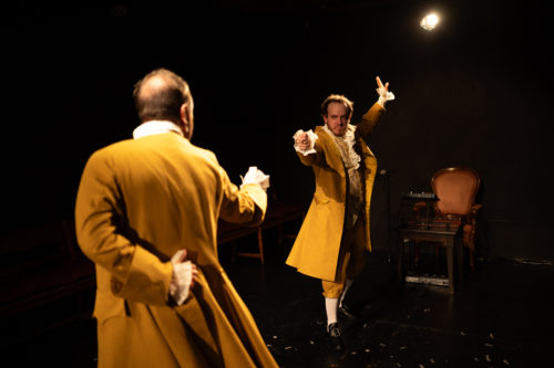 C’est en costumes d’époque – imaginés par Maya Bringhen, qu’on retrouve aussi en régie – que nous accueillent les deux complices, nous invitant à nous asseoir autour de la scénographie disposée « en 360° ». Ou plutôt en trifrontal, un fauteuil avec une table de mixage se trouvant contre le mur du fond de la salle. Ce soir, ils vont nous conter Les aventures du Baron de Münchhausen, classique de la littérature allemande, où absurde, cocasserie, mensonges et rire règnent en maîtres. Karl Friedrich Hieronymus von Münchhausen est connu pour sa moustache, sa force, son génie, sa bonté, et toute autre qualité imaginable. À moins que tout cela ne soit que mensonge ? Durant l’heure que dure le spectacle, on suivra son histoire, le jour où il a fait fuir deux ours avec une hachette, la fois où il a rencontré Vulcain, ou encore sa rencontre avec un général qui fut un temps svelte et fringant. Quant à savoir quel rôle le mensonge joue dans tout cela… il faudra voir le spectacle pour le savoir !