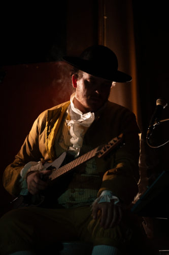 N’oublions pas non plus, dans tout cela, la dimension musicale de leur mise en scène. Jouée live, elle alterne guitare, électro avec synthé, et utilisation de boucles, créées par les instruments ou la voix. Donnant une certaine couleur au récit et à ses personnages, ils font en sorte qu’on ne tombe jamais dans l’ennui. Ils font même chanter le public, qui les accompagne avec enthousiasme sur le refrain de la dernière chanson, narrant de brèves aventures du baron. Attention : c’est entraînant et ça pourrait bien vous rester en tête. On vous aura prévenu-e-s ! Toujours accompagnées par la musique, les scènes mimées donnent encore une autre profondeur aux histoires. On a l’impression de voir la bête féroce qui pourchasse notre baron, ou le charbon qu’il reçoit de Vulcain et qui lui laissera des traces sur le corps. Sans compter les différents effets de voix et de lumière. Un spectacle total pour une véritable ode au théâtre, donc !