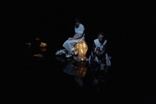 Tout commence par un récit à deux voix, à l’unisson. Rachel Gordy et Alexandra Tiedemann, tout de blanc vêtues, pieds nus, narrent la formation des montagnes et des glaciers, leur évolution, avant d’entrer dans le vif du sujet. Elles incarnent deux militantes qui vont grimper au sommet d’un glacier, en pleine nuit – les autorisations ne leur ayant pas été données – pour poser une plaque commémorative sur ce glacier désormais disparu. Cachées derrière des noms de codes, elles ne se rendent compte qu’au moment d’initier l’ascension, qu’elles se connaissent. Quel secret partagent-elles ? Quelle est la nature de leur relation et leur si fragile solidarité ? Aux engagements militants des deux femmes vient se mêler une histoire plus intime et personnelle.