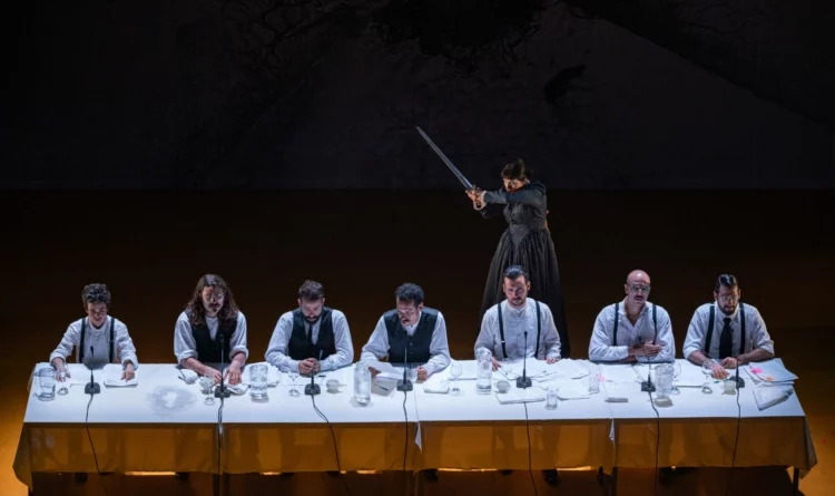 On voit l’entracte arriver comme la lumière au bout du tunnel. Brève lueur de quinze minutes puisqu’il faut bien retourner accompagner les douze travaux d’Herculina Bianchi. Au début de la seconde partie, on croit enfin tenir un fil conducteur avec cette grande tablée d’hommes qui mettent le nez dans les cinq cents pages d’écriture de notre performeuse de choc sur le viol et la violence. Mais les voilà à lire longuement des bribes éparses qui ont tendance, entre témoignages et statistiques, à souligner le dégoût de l’acte d’abus. L’un d’eux finira même par vomir sur scène… Bien qu’on pressente que cet équipage testostéroné exerce un pouvoir de censure sur les écrits de la femme – certains étant jugés trop brutaux… –, on se perd alors encore une fois au niveau du signifiant de l’ensemble, comme si le patchwork de la créativité prenait le pas sur le tapis persan d’une dramaturgie un tant soit peu cohérente.