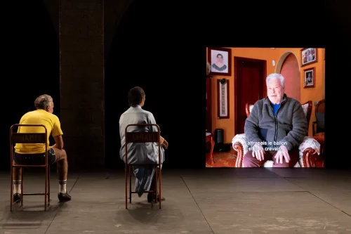 Simplement, nous rencontrons d’abord deux hommes libres sur le plateau. Mohamed en tenue de footballeur avec mocassins et Israel en djellaba couvrant des bas féminins. L’un et l’autre se jouent des codes et des conventions pour affirmer des singularités (d)étonnantes. Ils sont comme ils sont, n’en déplaise à leurs pères. Ceux-ci apparaissent d’ailleurs bien vite, chacun sur un grand écran, le Maroc à jardin, l’Espagne à cour. On les écoute parler de leurs enfants… qui les écoutent avec respect et volonté d’affranchissement, comme il se doit.