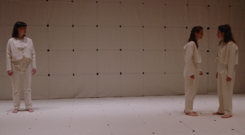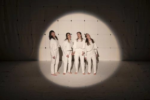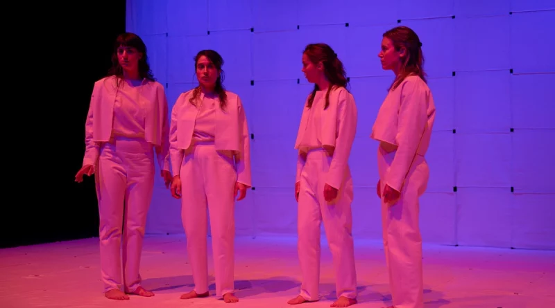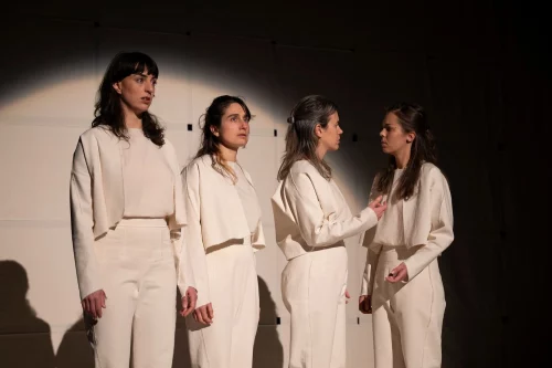 Le dispositif choral est l’outil principal : quatre actrices – elles aussi toutes de blanc vêtues – pour une seule héroïne : Rkvaa. Elles jouent tour à tour tantôt la protagoniste, tantôt les pensées qui la commentent, la bataillent, la sabotent. S’affirme alors un chœur de contradictions, d’hypothèses et d’auto-interruptions : un moi diffracté, en perpétuelle négociation, qui se cherche dans les méandres abscons d’une mémoire à reconstruire.