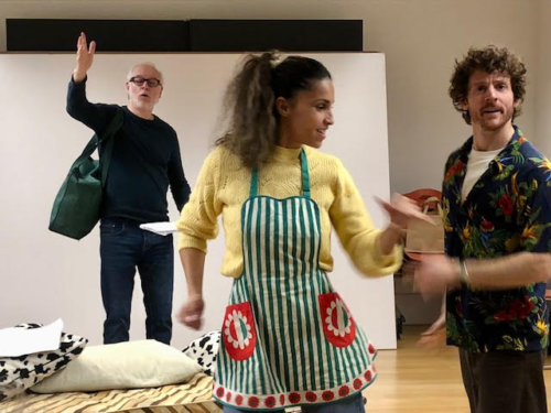 Tout l’humour tient sur le déséquilibre. Déséquilibre de situation avec un mari-amant (Antonin Schopfer) qui découvre le texte, un mari-cocu (Yves Zagagoni) qui s’exaspère à tout expliquer et une femme-maîtresse (Aoitef Kouki) – séduisante en diable – qui s’échappe de ses mariages, sans que nous n’en connaissions les raisons, on peut imaginer la lassitude sauvée par le goût du neuf. Déséquilibre à la lecture du texte – phase première de tout spectacle – qui livre par brassées entières un des ressorts classiques au théâtre : le tare pour barre. S’ensuivent les lectures de la fausse page, source de quiproquos traditionnels. Dans cette aventure, le public s’attend évidement à tout moment que la pile d’assiettes se fracasse. C’est l’image des assiettes de Schrödinger appliqué au théâtre.(1)