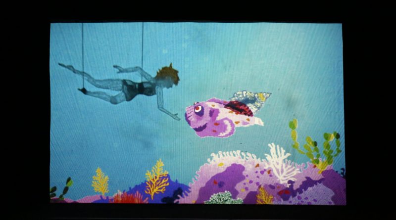 À ce film, qui évolue au fil de la plongée, se superpose un théâtre d’ombres colorées : de fines tiges permettent de manipuler les silhouettes des différents personnages, peintes sur un support transparent que la lumière traverse. Projetées en gigantesques sur l’écran où se déroule le film, les ombres colorées prennent vie. La fillette nage, ses mains plongent dans l’eau, le coquillage lui échappe… Seul regret de cette technique : tout se fait hors-champ. La manipulation du théâtre d’ombres se déroule derrière l’écran ; nous ne percevons que le résultat final, projeté. Pourtant, on aurait bien voulu observer la mécanique de cette étrange superposition ! Mais il faut le reconnaître : l’avantage de cette disposition, c’est qu’elle permet une immersion totale du jeune public dans l’histoire, sans élément « parasite » risquant de les sortir du récit en leur révélant les dessous de la magie.