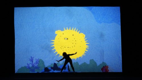 Pour ce faire, la Cie Succursale 101 opte pour un environnement musical créée par Uriel Barthélémi, tout en suggestions douces – un peu comme si on collait notre oreille à un coquillage pour entendre l’écho d’une chanson. À cela s’ajoutent des couleurs attrayantes : les bleus, bien sûr, avec toutes leurs déclinaisons d’azur, indigo, outremer, turquoise… Au début de l’aventure, ils sont lumineux, traversés de soleil. Mais, à mesure que l’héroïne s’enfonce dans l’océan, les voilà qui s’obscurcissent… jusqu’à disparaître dans l’obscurité des abysses. Aux bleus se mêlent le vert accueillant des algues, le rouge orangé des coraux, le jaune d’un poisson qui se faufile, le violet d’étranges anémones – autant de couleurs qui témoignent de la vitalité d’un écosystème qui se dévoile, petit à petit.