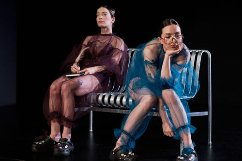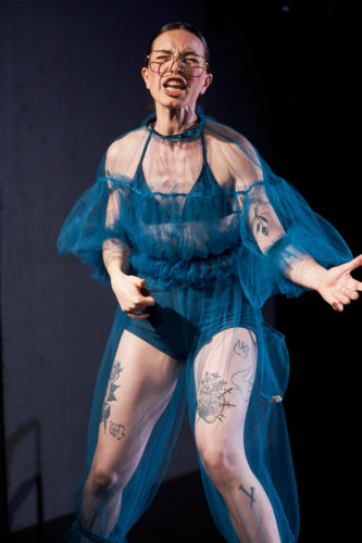Autant de sujets vertigineux abordés par les deux actrices qui se présentent au public à la lumière d’un lampadaire, habillé-es de voiles colorés et transparents mettant en valeur les physiques, les gestes… et les tatouages. C’est d’ailleurs une des marques de fabrique de la jeune compagnie La Poudre à lever : accorder autant de soin au mouvement du corps qu’à celui du texte. Et c’est réussi. Tout au long du spectacle, il y a une double lecture excitante : celle d’un langage direct[2] qui appelle une chatte une chatte et celle de ces corps jeunes, musclés et sensuels qui dansent sur scène en dévoilant ostensiblement les attraits décomplexés de la féminité.